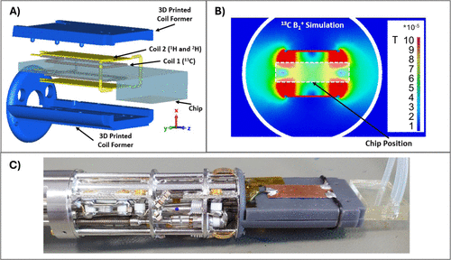 Figure 1. RF Coil design. (A) exploded view of the NMR probe head, showing the two RF coils, the 3D-printed support, and the microfluidic chip. (B) Cross-section (Z = 0 plane) of the simulated B1+ field distribution generated by Coil 1 at the 13C frequency (per 1 W accepted power). (C) Photograph of the fabricated NMR probe with the chip inserted.