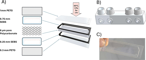 Figure 2. Fluidic chip production and assembly. (A) visual representation of the chip components and their assembly process. The stacked components are shown in order from top to bottom: 1 mm PETG, 0.75 mm SEBS, track-etched polycarbonate membrane (8 μm pore size, 18 μm thickness, 5% porosity), 0.25 mm SEBS, and 0.3 mm PETG. (B) 3D-printed inlets/injection ports, designed using SolidWorks, shown with female mini Luer connectors made from BioMed clear resin. (C) Fully assembled microfluidic chip.