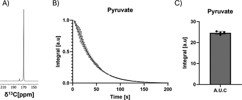Figure 3. Performance evaluation. (A) single pyruvate spectrum, SNR of the highest pyruvate peak was 5000, (B) substrate integral over time (n = 3) and (C) comparative substrate integrals (AUC = 24 ± 0.6) following injection of 10 mM hyperpolarized [1-13C] pyruvate, CV for the AUC was 2.5%. T1 of pyruvate was 52 ± 2 s.