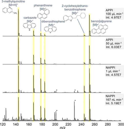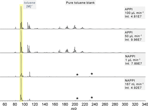 Figure 3. Measurements of phenanthrene in toluene at different concentrations with APPI at a flow rate of 50 μL min–1 and nAPPI at a flow rate of only 1 μL min–1. All spectra were measured on a TSQ triple quadrupole MS. *Plasticizer impurities.