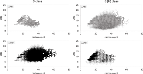 Figure 10. Kendrick plots of the S and S [H] class of the heavy crude for APPI and nAPPI.