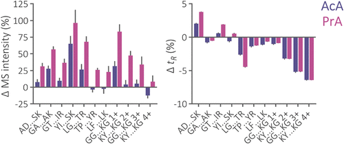 Figure 1. Relative change of total precursor MS intensity and retention time (tR) of peptides from iRT and Alberta sets separated using a 2.1 × 150 mm Acquity Premier CSH C18 column and mobile phase containing 0.5% AcA or 0.5% PrA in comparison to the separation using 0.1% FA. The iRT peptides are listed from left to right in the order of increasing isoelectric point. The number of protonated amino groups is indicated for Alberta peptides. For iRT and Alberta peptide properties, see Figure S1.