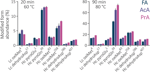 Figure 3. Relative abundance of the modified peptide forms in the 20 and 90 min separations of bevacizumab peptides using the 2.1 × 150 mm Acquity Premier CSH C18 column maintained at 60 and 80 °C. The abundance was calculated as the peak area of all the precursors of the modified peptide divided by the summed area of both peptide forms. The most abundant modified peptide containing the modified amino acid was used. Abbreviations: Lc – light chain, Hc – heavy chain. The superscripted numbers correspond to the position of the modified amino acid in the chain sequence.