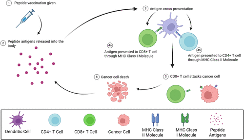 Figure 2. Overview of immune stimulation following the administration of a peptide vaccination. Following the administration of the peptide vaccination, the “drug load” or peptide antigens will be released into the body. The peptides within the body will be taken up by a dendritic cell, and processed either in the cytosol or an endosome, leading to both MHC Class I and Class II presentation. CD8+ and CD4+ T cells can then recognize antigens presented by MHC Class molecules, becoming mature T cells that can attack and destroy cancer cells.