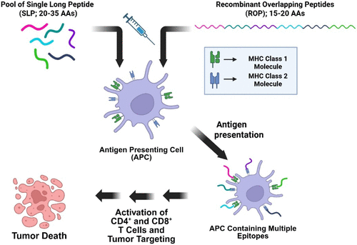 Figure 4. How SLP and ROP vaccinations stimulate the immune system. Both SLP and ROP vaccinations stimulate the immune system by being processed by APCs, leading to the activation of CD4+ and CD8+ T cells. However, SLP vaccinations comprise a pool of peptides, each representing a different antigen epitope, whereas ROP vaccinations contain a single peptide with multiple epitopes encoded within the peptide.