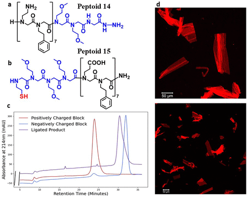 Figure 2. Evidence of the formation a nanosheet-forming product from the ligation of peptoids 14 and 15 (a) and (b) Sequences of peptoids 14 and 15, respectively. The loop segment is depicted in blue. (c) Analytical HPLC traces of pure peptoids 14 and 15, and the purified ligation product of the two (d) Fluorescence microcopy imaging of micron-scale peptoid nanosheets formed from the ligation product of peptoids 14 and 15. Nanosheets were stained with Nile Red dye and imaged on a Zeiss LSM710 confocal microscope.