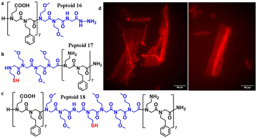 Figure 3. Formation of the expected product peptoid 18 from the ligation of peptoids 16 and 17. (a) and (b) Sequences of peptoids 16 and 17, respectively. (c) Sequence of ligation product peptoid 18. Loop segment is shown in blue. (d) Fluorescence microscopy imaging of peptoid nanosheets formed from peptoid 18. Nanosheets were stained with Nile Red dye on an inverted Zeiss Elyra 7 microscope.