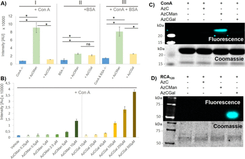 Figure 4. (A) Maximal fluorescence intensities of AzCMan and AzCGal probes at 10 μM concentration incubated with either ConA or BSA alone or a mixture of both proteins. Data represent the mean of four individual measurements. (B) Limit of detection for AzCMan and limit of selectivity for AzCGal. Data represent the mean of four individual measurements. (C) SDS–PAGE of ConA incubated with AzC glycan PAL probes after irradiation at 365 nm; the top panel shows AzC fluorescence and the lower panel shows Coomassie stain of the same gel. (D) SDS–PAGE of RCA120 incubated with AzC glycan PAL probes after irradiation at 365nm; the top panel shows AzC fluorescence and the lower panel shows Coomassie stain of the same gel. The complete SDS–PAGE images including the AzCManB probe are shown in the SI (Figure S37).