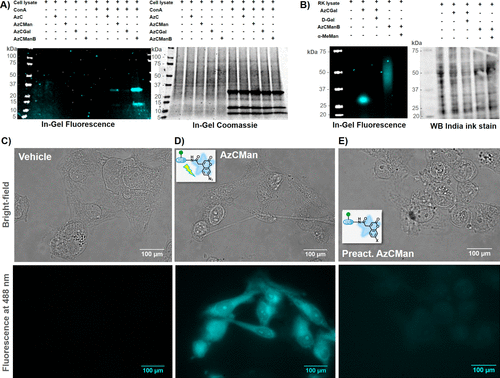 Figure 6. (A) SDS–PAGE showing MDA-MB 231 lysate with or without supplemented ConA that was incubated with various AzC glycan PAL probes and subsequently irradiated with UV light for 15 min. (B) Western blot of native rat kidney lysate that was incubated with AzCGal and AzCManB probes in the presence or absence of the respective carbohydrate inhibitors (α-MeMan and D-Gal) and subsequently irradiated with UV light for 15 min. (C–E) Microscope images (top: bright-field; bottom: fluorescence at 488 nm) of fixed MDA-MB-231 cells incubated with vehicle (C), AzCMan (D), or preactivated AzCMan (E) and subsequently irradiated at 365 nm for 15 min.