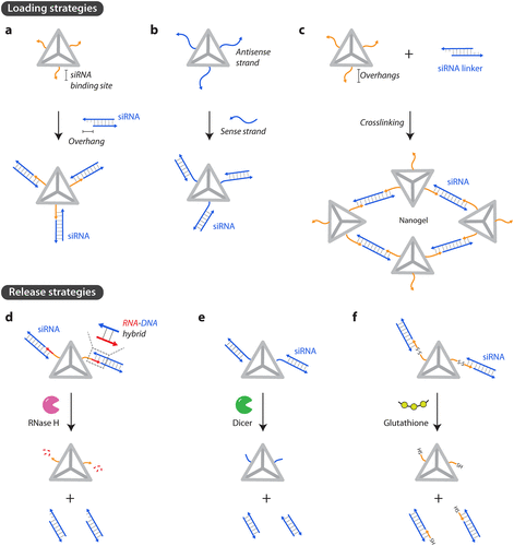 Figure 4. Loading and release of siRNAs. (a) Attachment to single-stranded overhangs on DNA nanostructures. (b) Antisense strand is part of the DNA nanostructure that can bind to the sense strand of the siRNA. (c) siRNA linkers can connect DNA nanostructures to create a nanogel. (d) Release of siRNA by RNase H activity, (e) Dicer activity, and (f) reduction of disulfide linkages by glutathione.