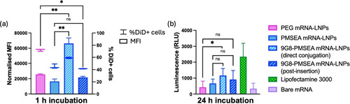 Figure 4. In vitro characterization of 9G8-PMSEA mRNA-LNPs prepared with different conjugation methods. (a) Cellular association of MDA-MB-468 incubated with PMSEA FLuc mRNA-LNPs with or without 9G8 attachment for 1 h and (b) luciferase expression of MDA-MB-468 incubated with PMSEA FLuc mRNA-LNPs with or without 9G8 attachment for 24 h. Statistical data is presented as the mean ± SD (n = 3 for flow cytometry; n = 4 for luciferase assay), ***p < 0.001, **p < 0.01, *p < 0.05, and ns p > 0.05 with 95% of confidence level from Welch’s unpaired t test.