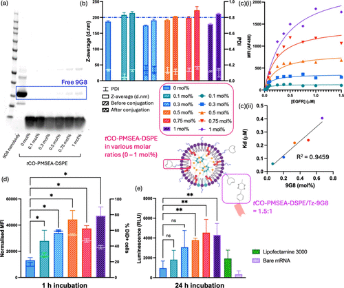 Figure 5. Physical and in vitro characterization of 9G8-PMSEA mRNA-LNPs with various molar ratios of tCO-PMSEA-DSPE (0 – 1 mol %) prepared by the direct conjugation method. (a) Gel image of 9G8-PMSEA mRNA-LNPs stained with Coomassie Blue. (b) Z-average and PDI of PMSEA mRNA-LNPs before and after conjugation, measured by DLS. (c) Flow cytometry analysis of 9G8 attachment on mRNA-LNPs via titration with various concentrations of AF488-labeled EGFR; (i) mean fluorescence intensity (MFI) of AF488 and (ii) half-maximum binding at equilibrium (Kd) calculated with the Saturation Binding model based on the titration results (R2 = 0.9459). (d) Cellular association of MDA-MB-468 incubated with PMSEA FLuc mRNA-LNPs with or without 9G8 for 1 h; and (e) luciferase expression of MDA-MB-468 incubated with PMSEA FLuc mRNA-LNPs with or without 9G8 for 24 h. Statistical data is presented as the mean ± SD (n = 3 for DLS and cell association assay; n = 4 for luciferase assay), ***p < 0.001, **p < 0.01, *p < 0.05, and ns p > 0.05 with 95% of confidence level from one-way ANOVA.