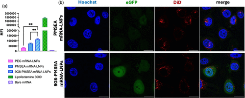 Figure 6. eGFP expression of MDA-MB-468 incubated with PMSEA eGFP mRNA-LNPs with or without 9G8 attachment for 24 h. (a) Mean fluorescence intensity (MFI) of eGFP quantified by flow cytometry. Statistical data is presented as the mean ± SD (n = 3), ***p < 0.001, **p < 0.01, *p < 0.05, and ns p > 0.05 with 95% of confidence level from Welch’s unpaired t test. (b) Confocal images of eGFP transfection and cellular association with DiD-labeled eGFP mRNA-LNPs for 24 h with Hoechst staining MDA-MB-468 nuclei; scale bars are 20 μm).