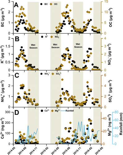 Figure 1. Temporal variations in mass concentrations of the main constituents of PM2.5 aerosols at Rwanda Climate Observatory during 2014–2016 period. The investigated PM2.5 species exhibit strong seasonality, with low aerosol concentrations observed during the wet seasons (highlighted with gray background). Data gap exists between December 2014 and April 2015 due to instrument failure after a lightning strike.