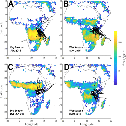 Figure 2. Satellite fire observations and air mass back trajectories at the Rwanda Climate Observatory. The blue-green-yellow color scheme depicts the number of fire detections from MODIS-FIRMS per square degree grid. Every second day, back-trajectory with arrival time at 3 AM CET is depicted as black dotted lines. (A) June–July–August (JJA), 2015. (B) September–October–November (SON), 2015. (C) December–January–February (DJF), 2015/16. (D) March–April–May (MAM), 2016.