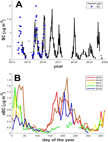 Figure 3. Multiyear (2014–2019) BC concentrations trends for Rwanda Climate Observatory. (A) Temporal variability in weekly averaged (night-time-only) equivalent BC data─retrieved from an AE33 aethalometer at 880 nm. The eBC (black plot) was compared against the Sunset Laboratory thermo-optical measurement data (blue dots; see SI notes S1). (B) Visualization of differences in daily/weekly de-trended annual variability in eBC concentrations (color scheme depicts different years). The spikes in the aethalometer data, potentially from instrumental errors or short-term pollution events were removed as explained in SI Note S1.