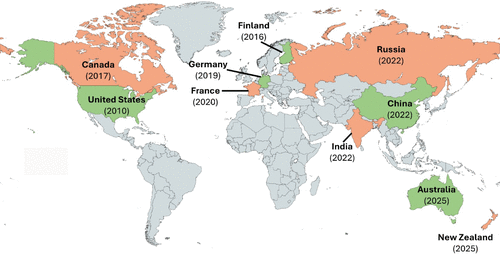Figure 3. First published WRTDS applications across continents and countries, highlighting its global adoption. Colors are used to clarify the boundaries between neighboring countries. Base map source: MapChart (https://www.mapchart.net), licensed under CC BY-SA 4.0.
