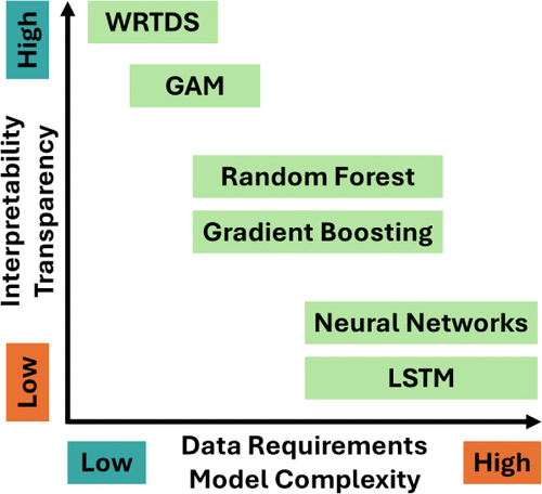 Figure 5. Conceptual comparison of WRTDS with regression and machine-learning models, illustrating tradeoffs between interpretability/transparency (vertical axis) and data requirements/model complexity (horizontal axis). WRTDS combines high interpretability and transparency with relatively low data requirements and complexity.