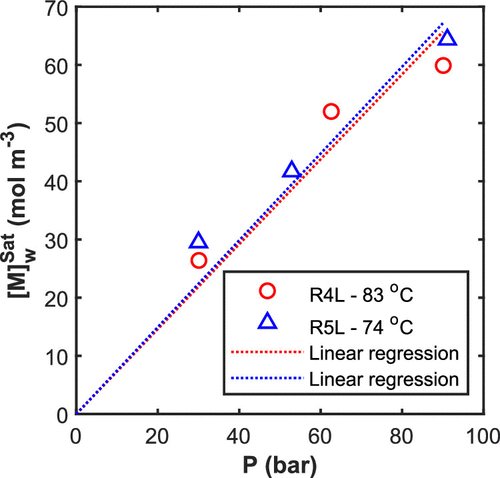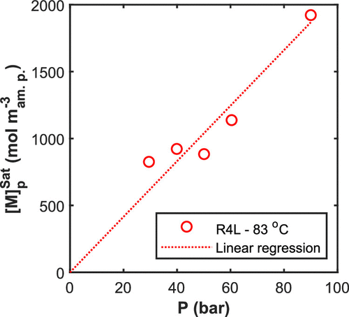 | concentration of monomer in water at saturation (mol m–3) | T (°C) | P (bar) | |