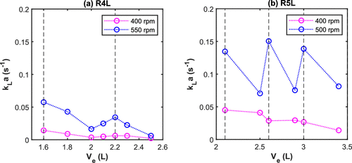 Figure 7. Experimental volumetric mass transfer coefficient (kLa) as a function of the latex volume at 30 bar and 10% SC (a) R4L reactor at 83 °C and (b) R5L reactor at 74 °C (vertical dashed lines = midpoint of the impeller blades).