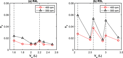 Figure 8. Estimation of the vortex area av (by CFD) as a function of volume of water for (a) R4L reactor and (b) R5L reactor (vertical dashed lines = midpoint of the impeller blades).