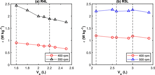 Figure 9. Average turbulent energy dissipation rate obtained by CFD for (a) reactor R4L and (b) reactor R5L (vertical dashed lines = midpoint of the impeller blades).