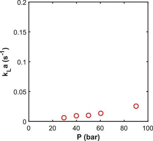 Figure 10. Volumetric mass transfer coefficient at 83 °C estimated by model fitting of the pressure absorption. Experimental condition for R4L reactor, Setup2, 550 rpm, and 2.5 L latex.