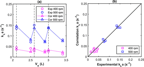 Figure 13. (a) Volumetric mass transfer coefficient (kLa) (experimental and by eq 20) and (b) correlation versus experimental values of kLa at 74 °C, 30 bar, and 10% SC for the R5L reactor (vertical dashed lines = midpoint of the impeller blades).
