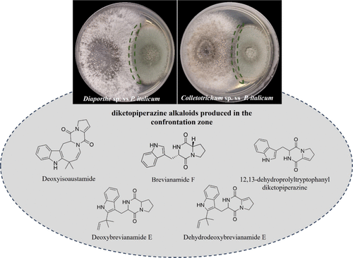 Figure 4. Confrontation assay betweenP. italicum and endophytic fungi. (Upper): coculture assays showing the interaction zones betweenP. italicum andDiaporthe sp. (left) orP. italicum andColletotrichum sp. (right). Dashed green lines highlight the confrontation zone. (Lower): diketopiperazine alkaloids detected in the confrontation zone through LC–HRMS analysis and structure annotation: deoxyisoaustamide, brevianamide F, 12,13-dehydroprolyltryptophanyldiketopiperazine, deoxybrevianamide E, and dehydrodeoxybrevianamide E.