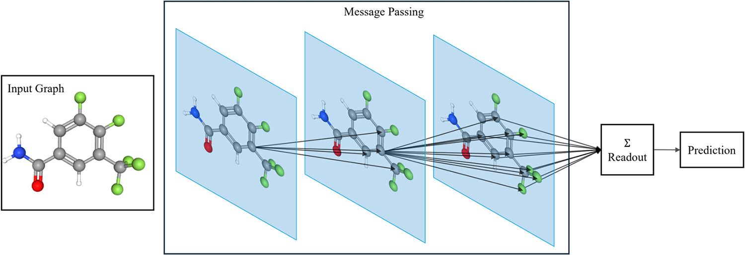 Figure 1. General architecture of a GNN for molecular property prediction. The input molecular graph is processed through multiple message passing layers, where the node embeddings are iteratively updated by propagating information from neighboring atoms. These updated representations are then combined by a readout function (e.g., average or sum) to produce a graph-level embedding, which is fed into a downstream prediction layer.