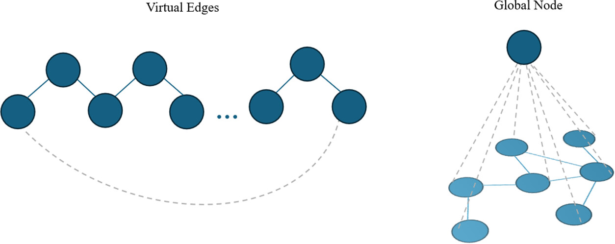 Figure 2. Two graph augmentations in polymer GNN architectures: a virtual edges connecting distant nodes to encode periodic or long-range interactions (left), and a global node connected to all nodes to capture system-level or graph-wide information (right).
