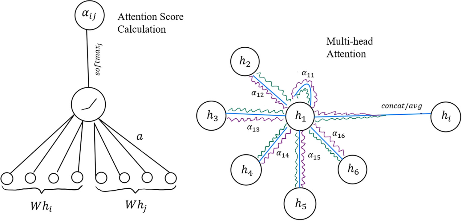 Figure 3. An illustration of GAT operations. The left portion of the diagram shows how attention coefficients αij are computed: the transformed node features Whi and Whj are concatenated and passed through a shared attention mechanism parametrized by the vector a, followed by a LeakyReLU nonlinearity and a softmax normalization over all neighbors j ∈ Ni. The resulting coefficient αij encodes the learned importance of neighbor j when updating node i. The right portion illustrates multihead attention for a specific node (node 1 in the drawing): each neighbor contributes messages through multiple attention heads (depicted by the green, blue and purple lines), producing head-specific weights α1j(k) and transformed messages W(k)hj. The index k refers to the attention head number, where each head has its own learnable weight matrix W(k) and produces its own attention score. These per-head aggregations are combined via concatenation (for intermediate layers) or averaging (for final layers) to yield the updated node embedding hi. The diagram highlights both key components of GATs: attention-based neighborhood weighting and multihead message aggregation.
