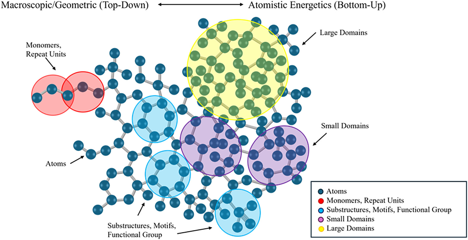 Figure 4. Conceptual depiction of CG in polymer informatics. The top bar represents the (abstract) spectrum of CG strategies from macroscopic, geometry-based top-down strategies to atomistic, energetics-based bottom-up approaches. The molecular structure is overlaid with color-coded regions representing multiple levels of abstraction: atoms (gray), monomer/repeat units (red), substructures, functional groups or motifs (blue), small domains (purple), and large domains (yellow). This hierarchy also illustrates the conceptual transition from atomistic to increasingly coarse-grained graph representations, by grouping chemically or structurally important substructures so that scalable and interpretable ML pipelines are achievable.