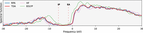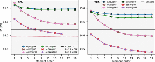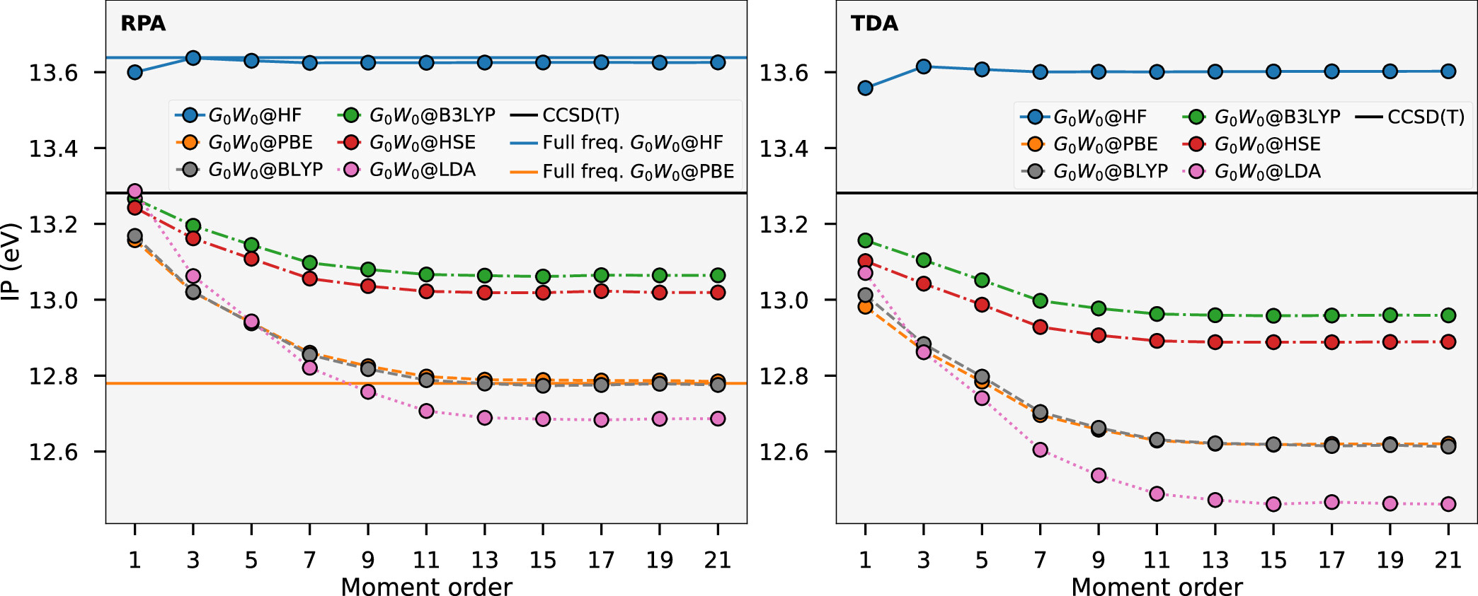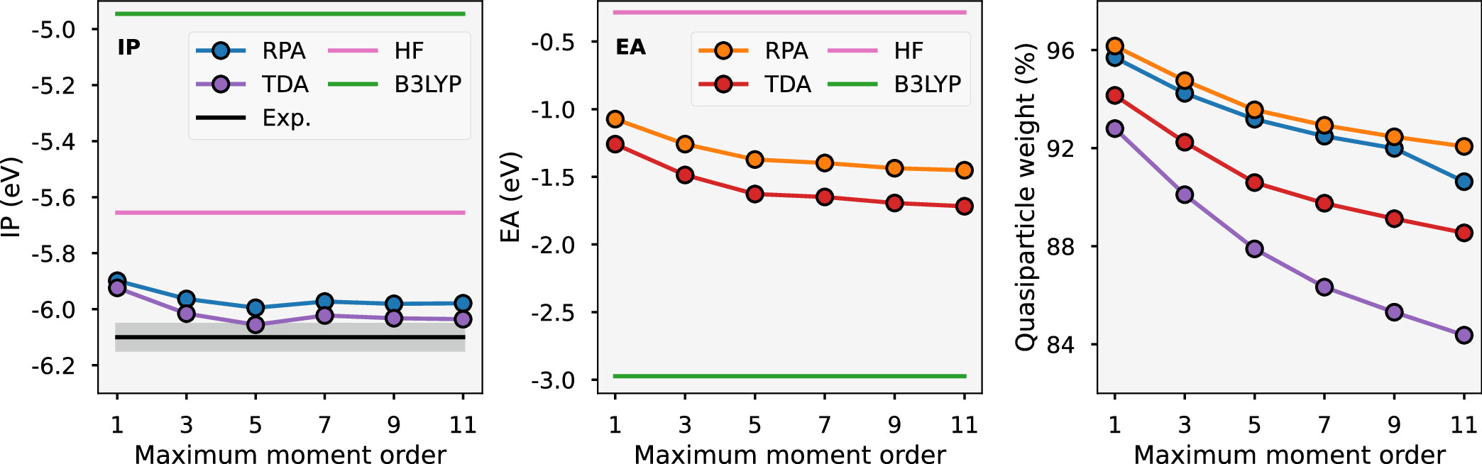 Since the dimension of the effective Hamiltonian of eq 9 scales linearly with the number of moments, increasing the moment order correspondingly increases the number of poles in the resulting spectral function of eq 12. In this way, the moment order can be seen to directly control the effective resolution of the dynamics of the self-energy (and thus Green’s function) across the entire spectral range, with increased splitting of the self-energy poles at higher moment orders. Furthermore, since the numerator of the Green’s function of eq 11 corresponds to the component of the eigenvector corresponding to each excitation in the physical space (i.e., once the external space is traced out), this can be less than unity, describing a suppression of spectral weight due to the correlations and a reduced quasiparticle weight of the excitation in the spectrum. This contrasts with more traditional GW approaches where each excitation is obtained independently via a self-consistent solution (or linearized approximation) of the quasiparticle equation, assuming a diagonal self-energy. (22) Allowing for the coupling between the bare quasiparticle states afforded by nondiagonal elements of the self-energy (moments) admits electron density relaxation by mixing these states (even at the G0W0 level), and can also (along with the dynamics) split the quasiparticle states in more strongly correlated systems. (48) The coupled external space also results in an increased number of solutions compared to the quasiparticle approximation, additionally providing lower-weighted incoherent excitations associated with satellite peaks. (8,49)