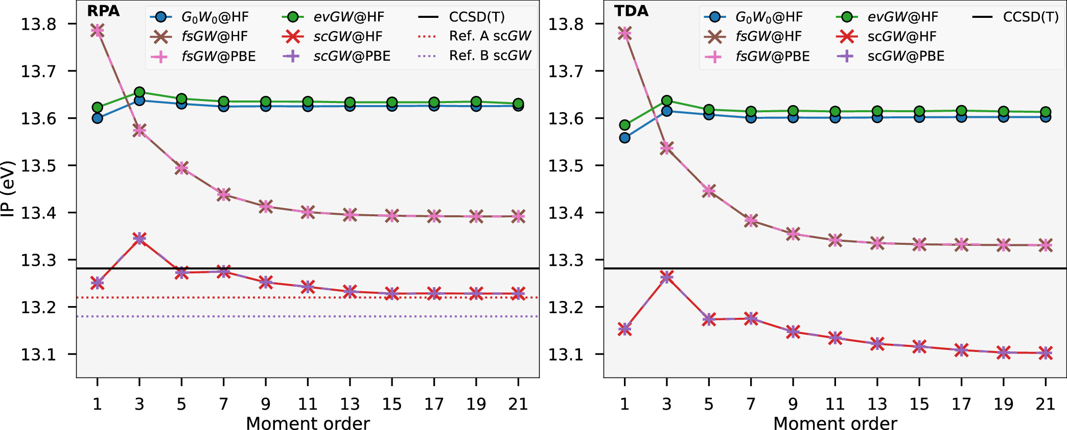 We also consider the use of interactions screened both at the random phase approximation (RPA) level, as well as the Tamm–Dancoff approximation (TDA), which neglects one of the time-orderings of the bubble diagrams in the screening channel. (10) We find that this TDA screening outperforms RPA in this molecular context and results in a particularly simple computational moment expansion approach. Furthermore, in Section 3.6, we detail the implementation of a largely unexplored variant of self-consistency which we dub ‘Fock self-consistency’, where the density matrix is made consistent across the mean-field and correlated levels of theory. In Section 4, we find this to be the most accurate variant across the considered test set while remaining highly efficient, which indicates significant potential for its use in molecular contexts. Finally, in Section 5, we apply the approach for the full-frequency dynamics of the Chlorophyll molecule, with both TDA and RPA screening, and observe the convergence of the frontier excitations and quasiparticle renormalization with respect to moment order. With TDA screening, the results align well with experimental results for the first ionization potential.