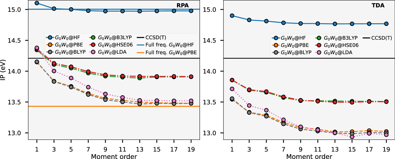 We note that this is the correct physical scaling of the information content for self-energy for large systems. A scaling in the number of explicit poles which is greater than linear would at some system size no longer be able to be resolved on any finite grid of frequency points, with poles merging under infinitesimal broadening. Therefore, this moment expansion represents a physical compression of the self-energy for realistic systems. We also found this representation to be efficiently computable at the GW level, and rapidly converges to the full spectral dynamics with respect to this moment order over all energies, since it is not specifically targeting any particular (e.g., frontier) excitation energy scale. This compact and rapidly convergent expansion in terms of spectral moments can also be used to formulate variants of other spectral methods, including GF2 (34−36) and (extended) dynamical mean-field theory, (37−39) as well as being a alternative perspective in which to motivate new approximations. (40)
