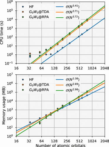 Figure 1. Performance benchmark for the moment-conserving G0W0 implementation, indicating CPU time (top) and memory usage (bottom) for increasing numbers of atomic orbitals in linear alkane chains up to C32H66 in a cc-pVDZ basis, with maximum moment order nmommax = 7, obtaining the full G0W0 spectrum for each calculation. No natural auxiliary orbital compression was used in this consideration of resource scaling. Lines are shown for both TDA and RPA screening, and for Hartree–Fock via PySCF for comparison.