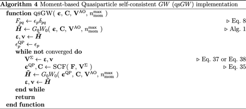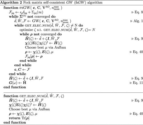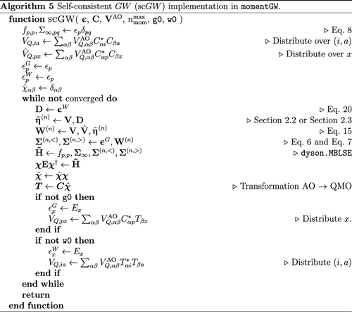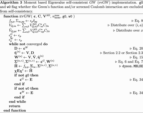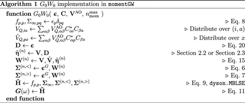 In this section, we recap the moment-conserving GW approach introduced in ref (27), as well as highlight a number of algorithmic improvements, optimizations, and parallelism that depart from the previous presentation. We also provide the formulation in terms of spatial orbitals, assuming a restricted, time-reversal symmetric reference state, in contrast to previous spin–orbital expressions. The central step of GW is the construction of the dynamic self-energy from the convolution of the Green’s function and screened Coulomb interaction as a first-order perturbative expansion