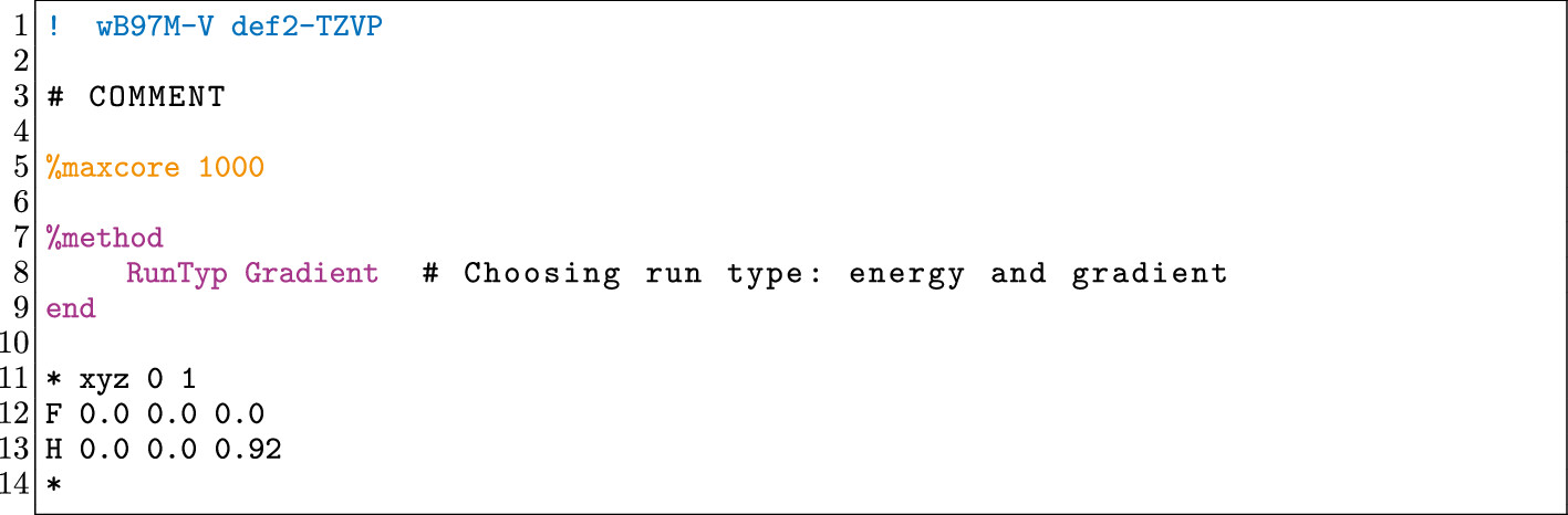 Figure 3. Example of a simple ORCA input containing all major input elements: Simple input keywords (blue), key-value options (orange), block options (purple), and the coordinates block (black).