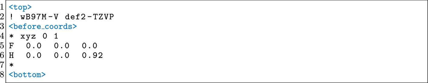 Figure 8. Excerpt of a minimal ORCA input file showing the three principal positions for input keywords defined in OPI: top: At the very top of the file; before_coords: Right before the coordinates block; bottom: At the very end of the file.