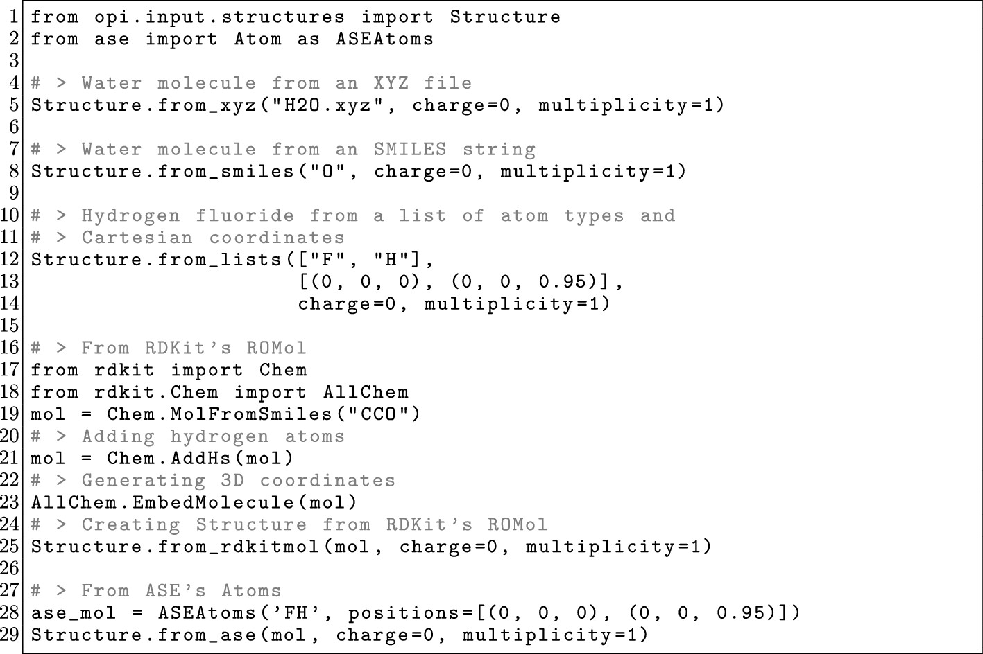 Figure 9. OPI example showcasing the different methods to create a Structure object from different sources.