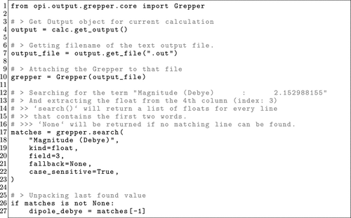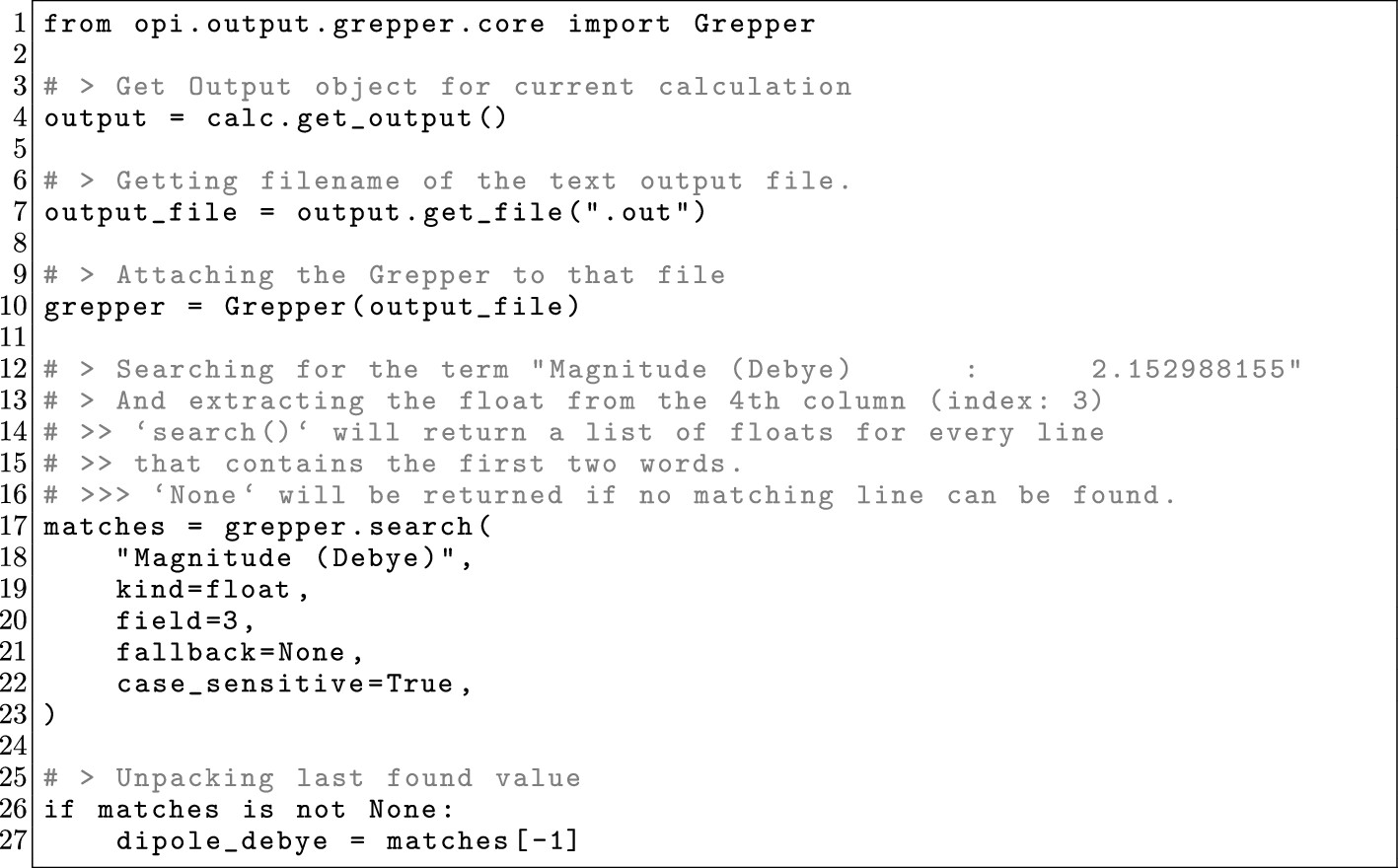 Figure 16. Minimal OPI example of the Grepper class, showcasing how to use the class to search for the line containing “Magnitude (Debye): 2.152988155” in the ORCA output of a completed calculation and extracting the value.