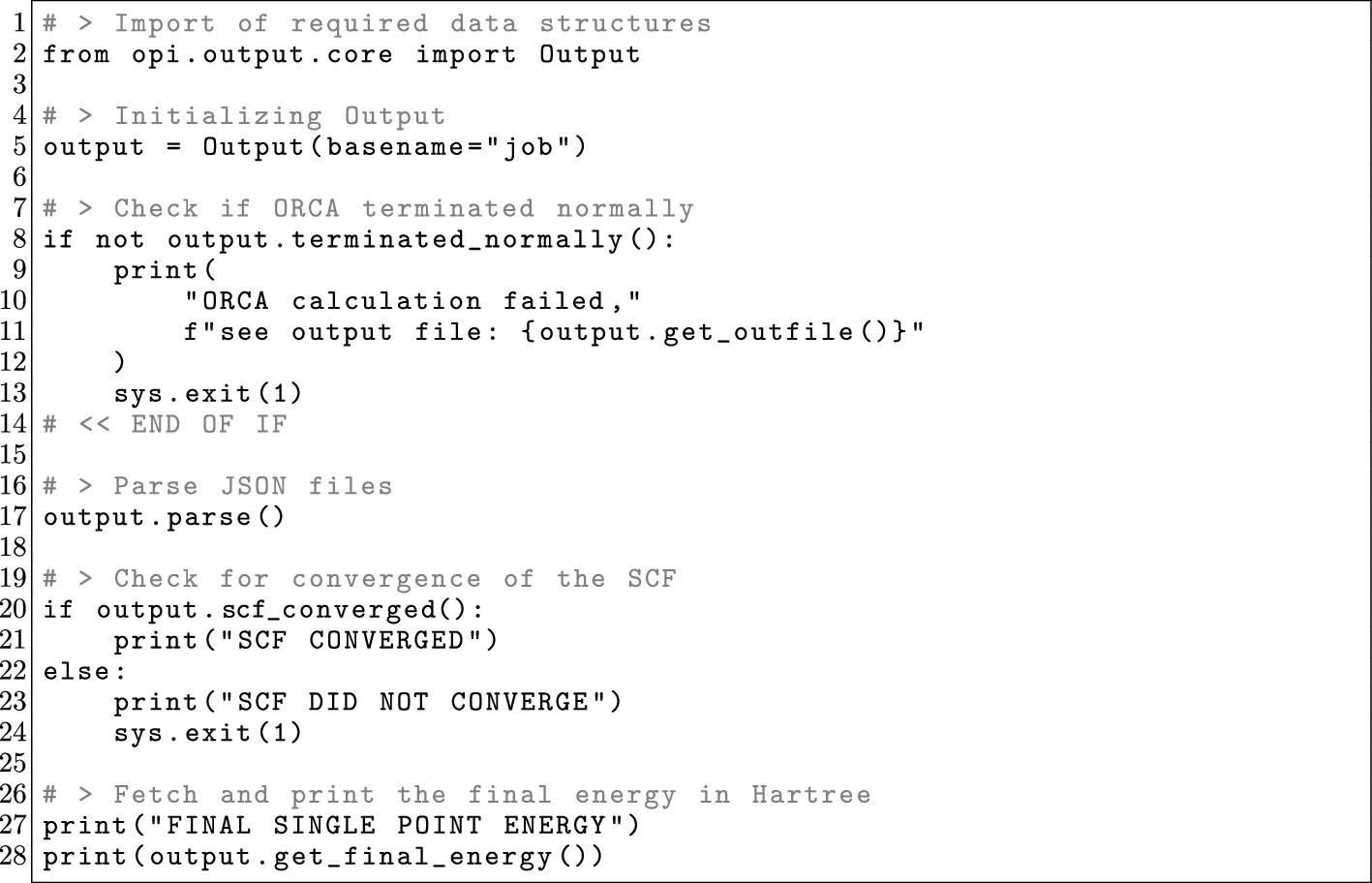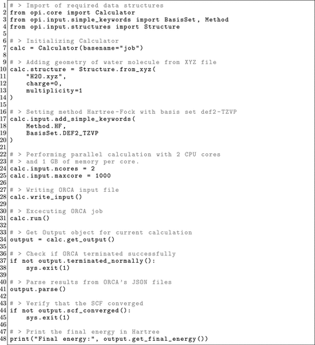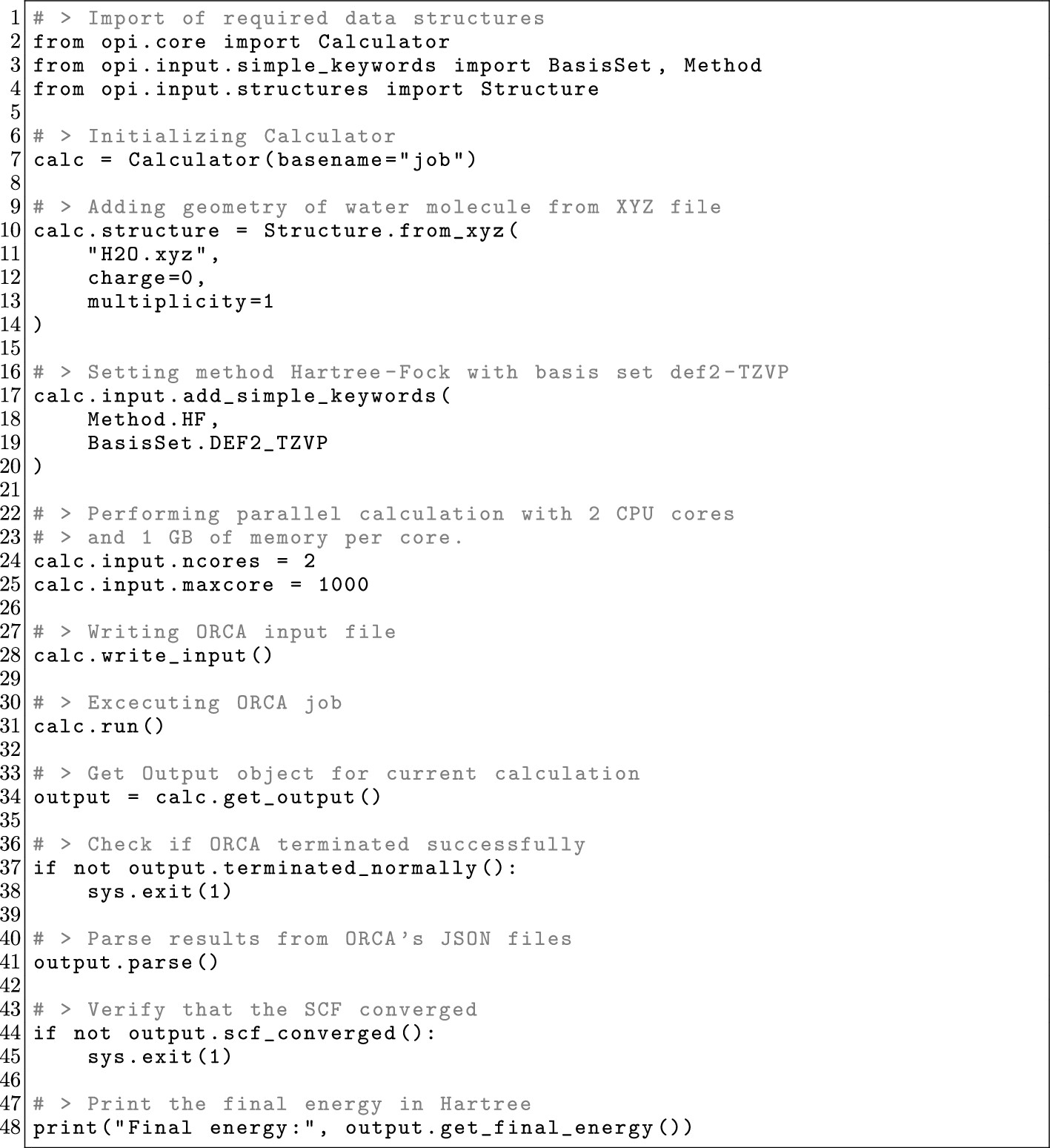 Figure 18. OPI example script of a simple energy calculation for a water molecule. It displays all steps involved: input definition, input creation, job execution, and printing of the final energy.