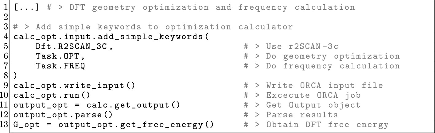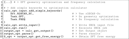 Figure 20. OPI example for performing a r2SCAN-3c geometry optimization followed by a frequency calculation to obtain a free energy.