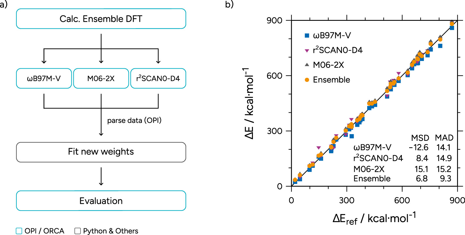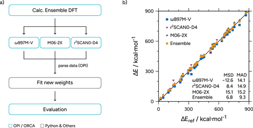 Figure 28. (a) Flowchart of the process of determining the ensemble weights. (b) Correlation plot of the tested functionals on the MB16-43 as well as the ensemble optimized on the set. MSDs and MADs are given in kcal·mol–1. One data point below 0 kcal·mol–1 and two above 900 kcal·mol–1 are omitted for clarity.