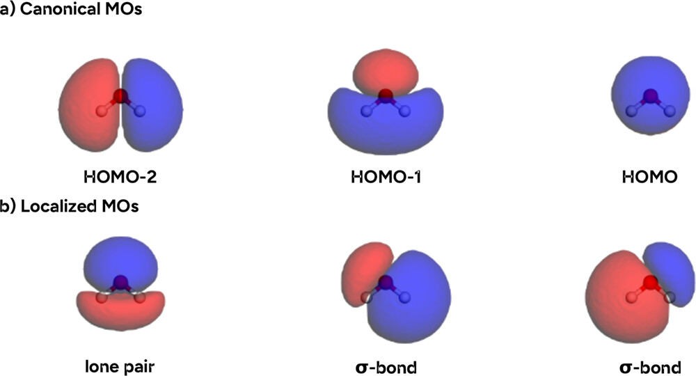 Figure 30. (a) Canonical frontier orbitals and (b) Pipek–Mezey localized orbitals of water (GFN2-xTB level) as plotted in the example notebook.