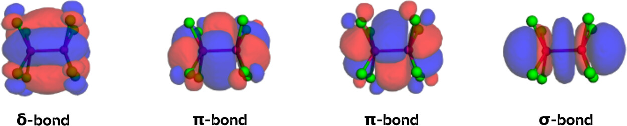 Figure 31. Bonding LMOs (PBE0/def2-SVP, Pipek-Mezey orbital localization) for [Re2Cl8]2– as plotted in the example notebook. The δ-, two π-, and the σ-bonds can be identified in line with chemical intuition.