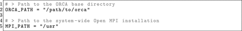 Figure 10. Example of an OPI configuration file specifying the location of ORCA and Open MPI. The file adheres to the TOML format.