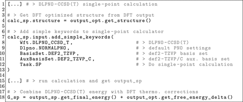 Figure 21. OPI example of how to combine a high-level DLPNO–CCSD(T) single-point energy with thermostatistical corrections from DFT to obtain a free energy.