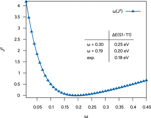 Figure 25. Plot of ω as a function of J2 and S1-T1 gaps computed with the default and optimally tuned ω in comparison to the experimental reference (cf. ref (98)).
